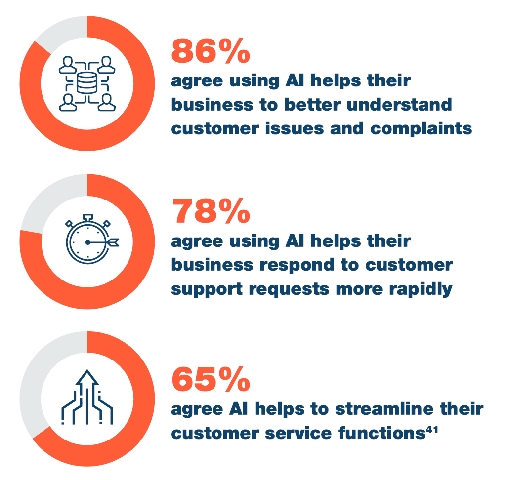 Many businesses are already integrating AI into their customer support functions and, by doing so, are seeing notable improvements in understanding customer issues and resolving them quickly. A significant 44% of the businesses we surveyed said they are currently using AI for customer service40, and these businesses noted the following benefits: