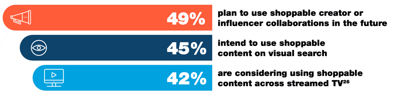 Increase engagement and conversion rates: Nearly half (42%) of companies that have used shoppable ads believe the format can drive increased engagement and conversion rates29, as consumers are receptive to recommendations while on the platforms they use to discover products. Over a third (37%) of those who have not yet used shoppable ads also expect this to be a benefit30.