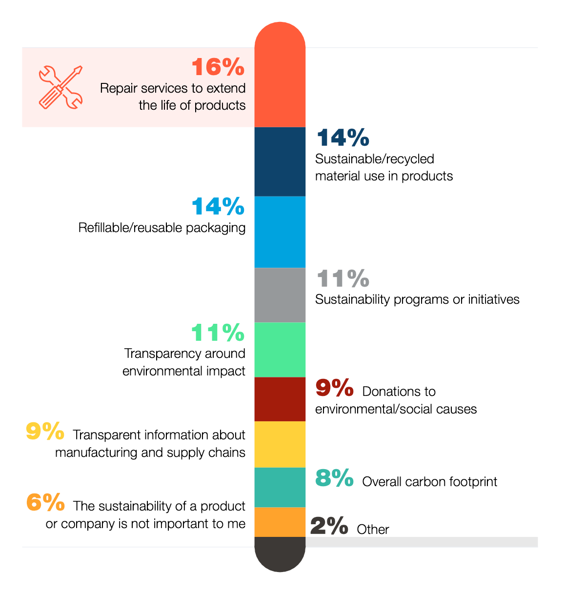 To understand what aspects of sustainability people are really interested in when deciding whether to spend their money with a particular company or not, we asked our survey respondents to select the factor that is most important to them.